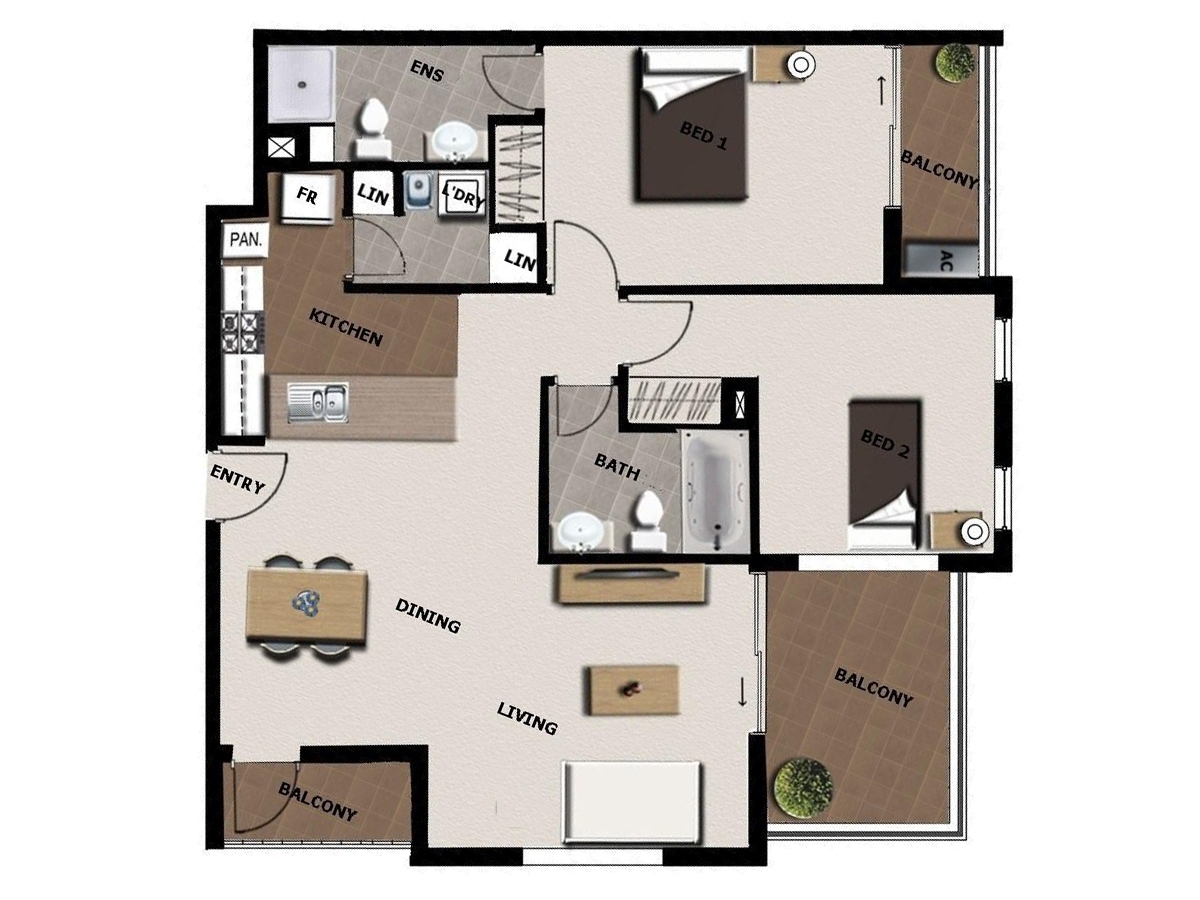 • Spacious open plan living & dining with air-conditioning + balconies off both areas