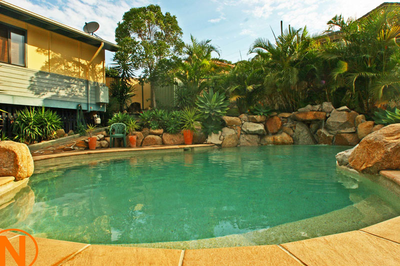 - In- ground swimming pool with waterfall and decked entertaining area