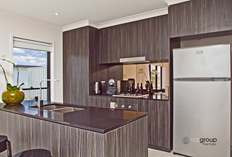 - Stone bench tops and stainless steel kitchen appliances
