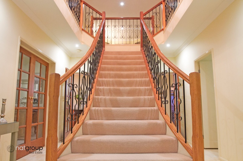 • Flared Y style grand staircase with glistening statement chandelier