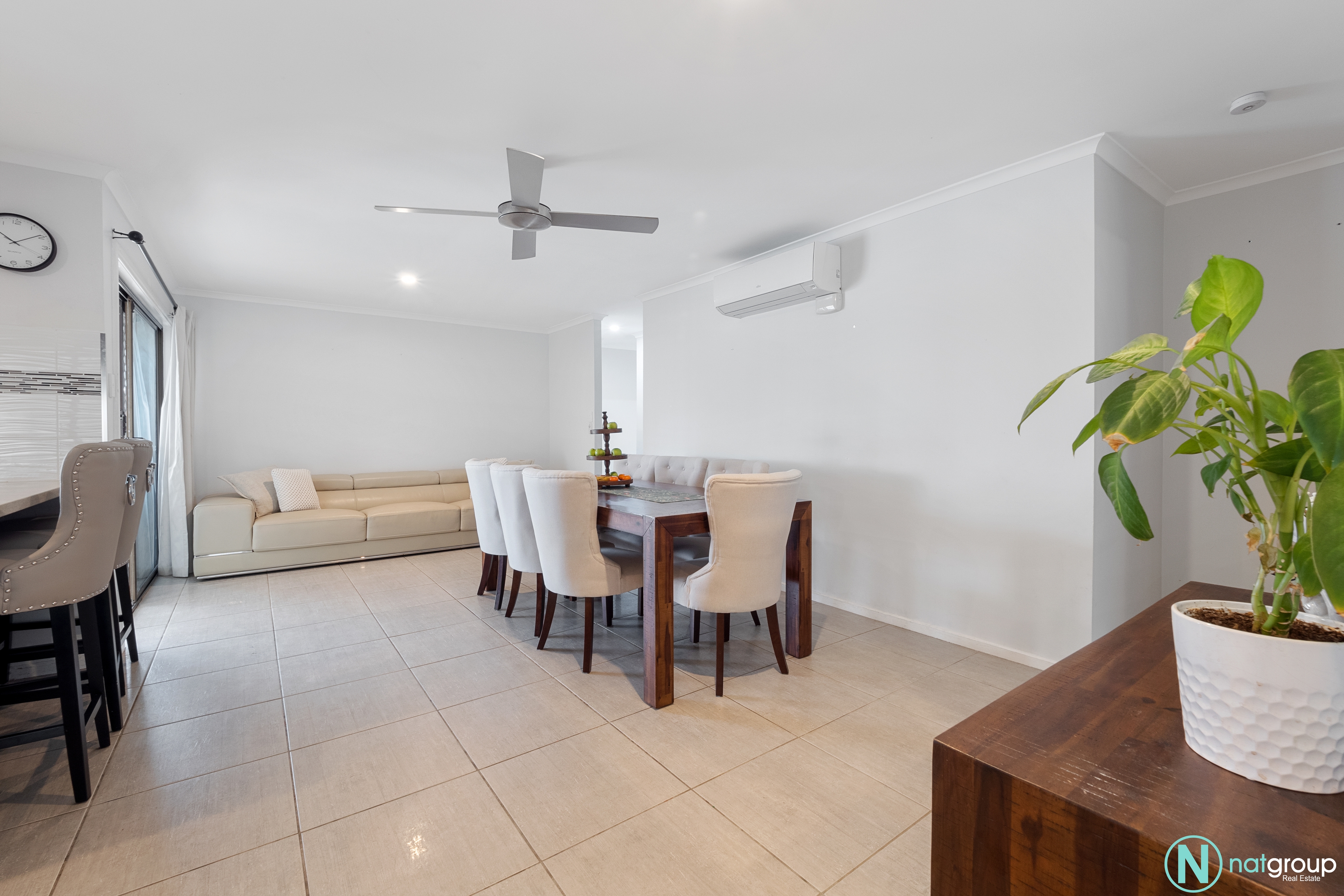 ?️ Family/dining room opposite kitchen with ceiling fan and air conditioner