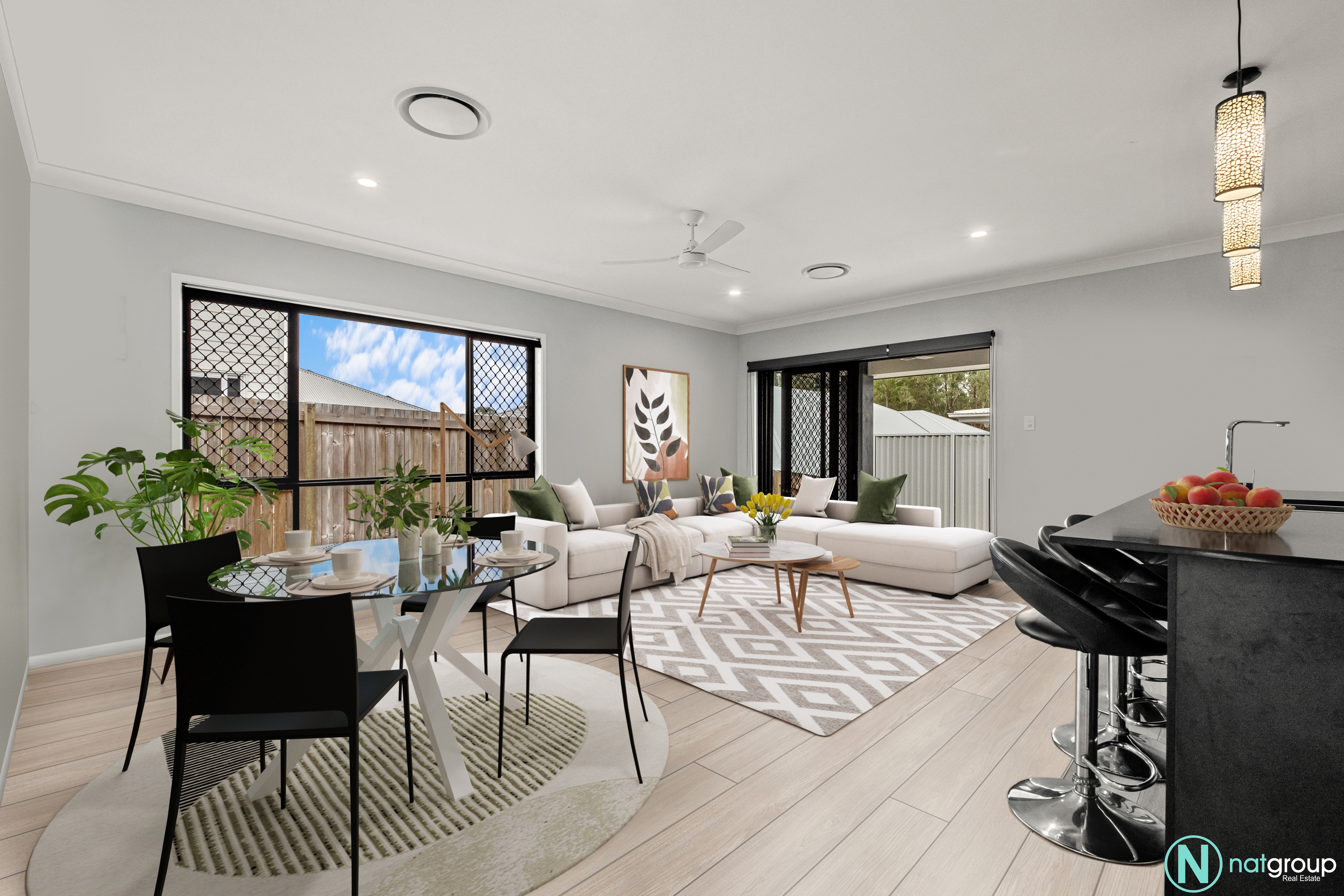 - Separate media room and open-plan living/dining area